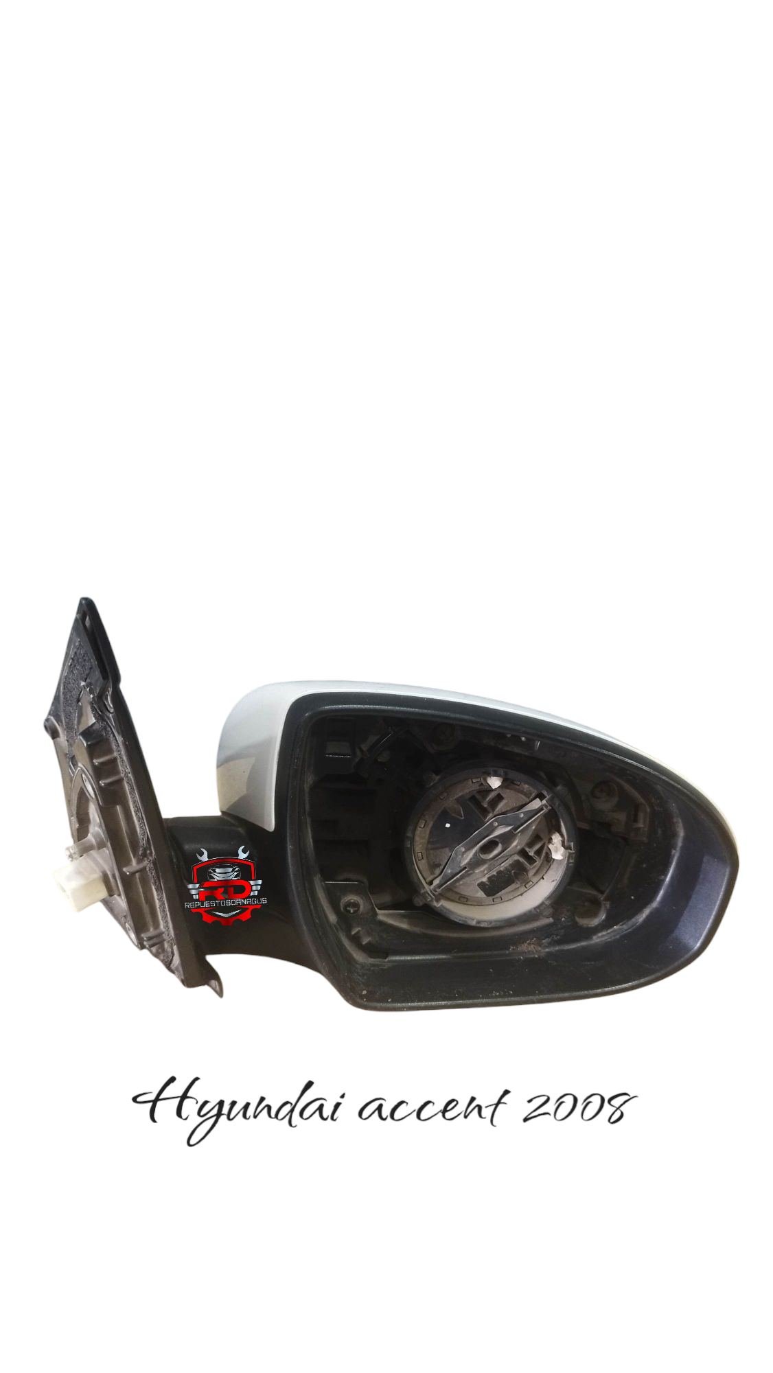 El Hyundai New Accent 2008 cuenta con un espejo derecho original en color blanco, aunque falta el vidrio de la luneta. Esto garantiza su autenticidad y funcionamiento.electrico